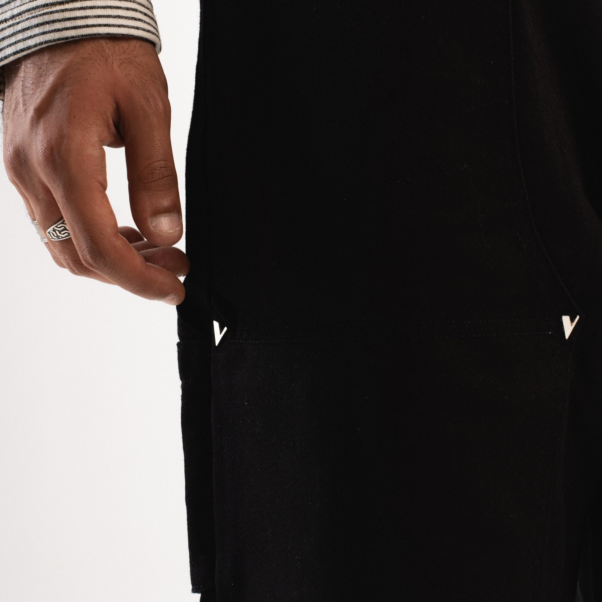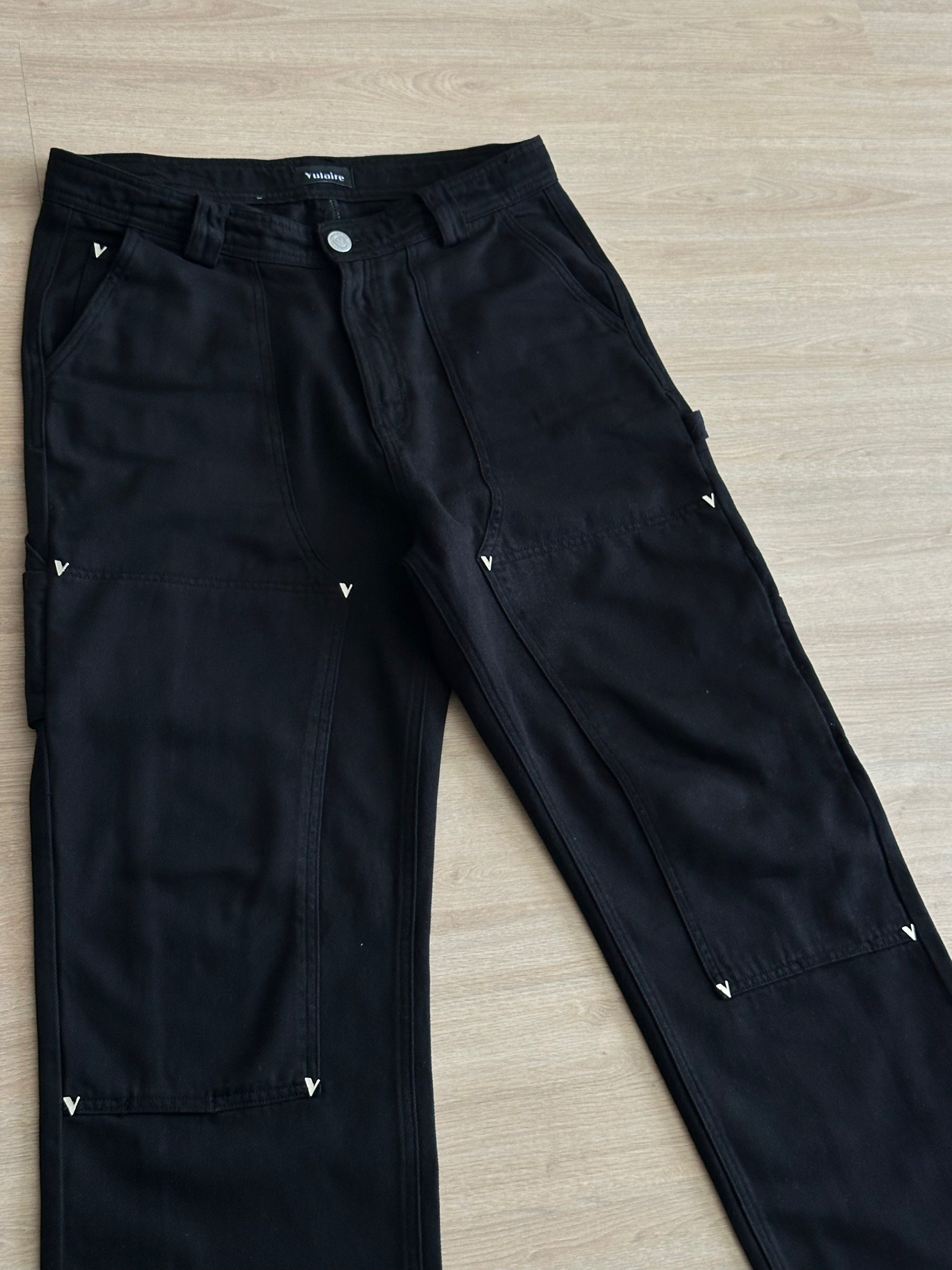 The standout detail is the signature “V” metal pins, placed throughout the design, adding a bold and unique touch that sets these pants apart. With functional pockets and reinforced stitching, these pants provide practicality, making them a versatile addition to any wardrobe.